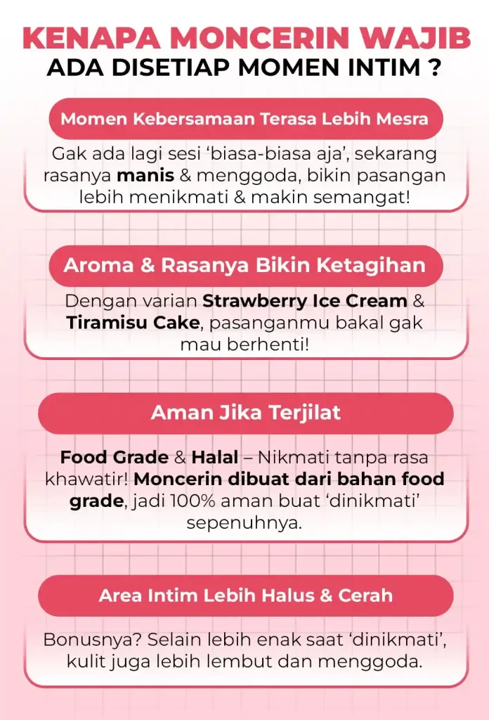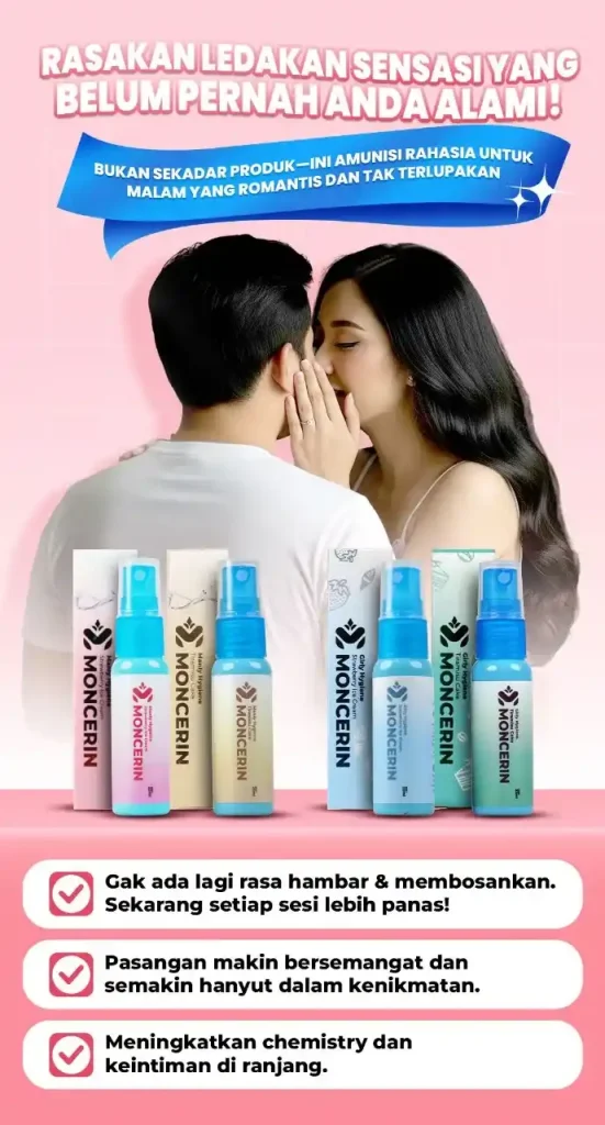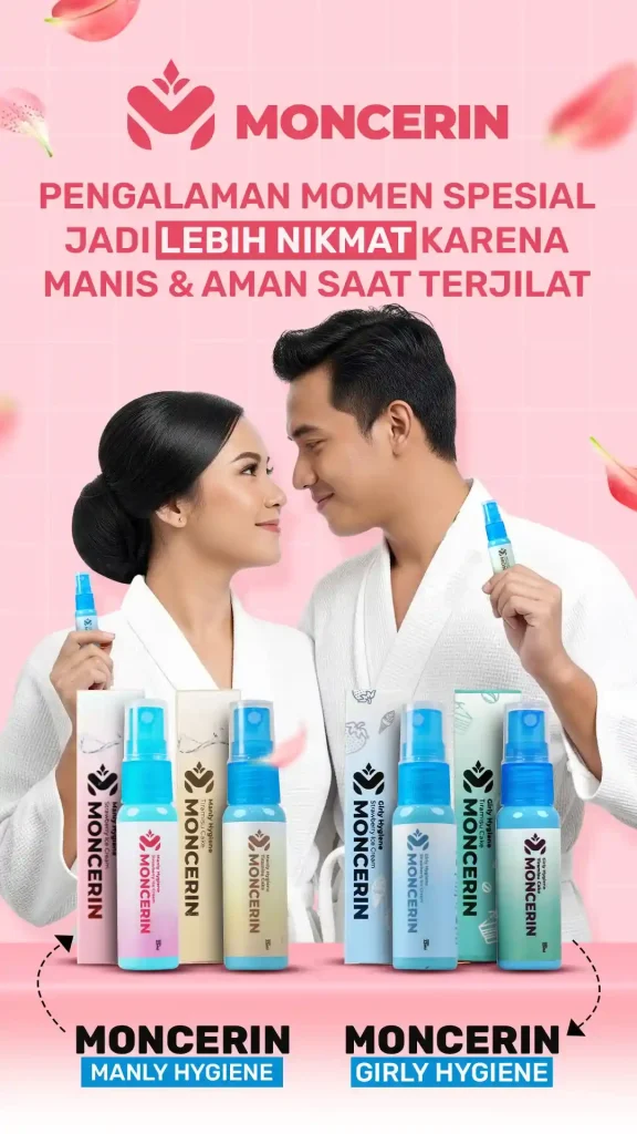Moncerin adalah spray perawatan area intim yang memberi aroma segar dan rasa manis 🍓. Aman jika terjilat, bikin pasangan makin menikmati tanpa ragu.